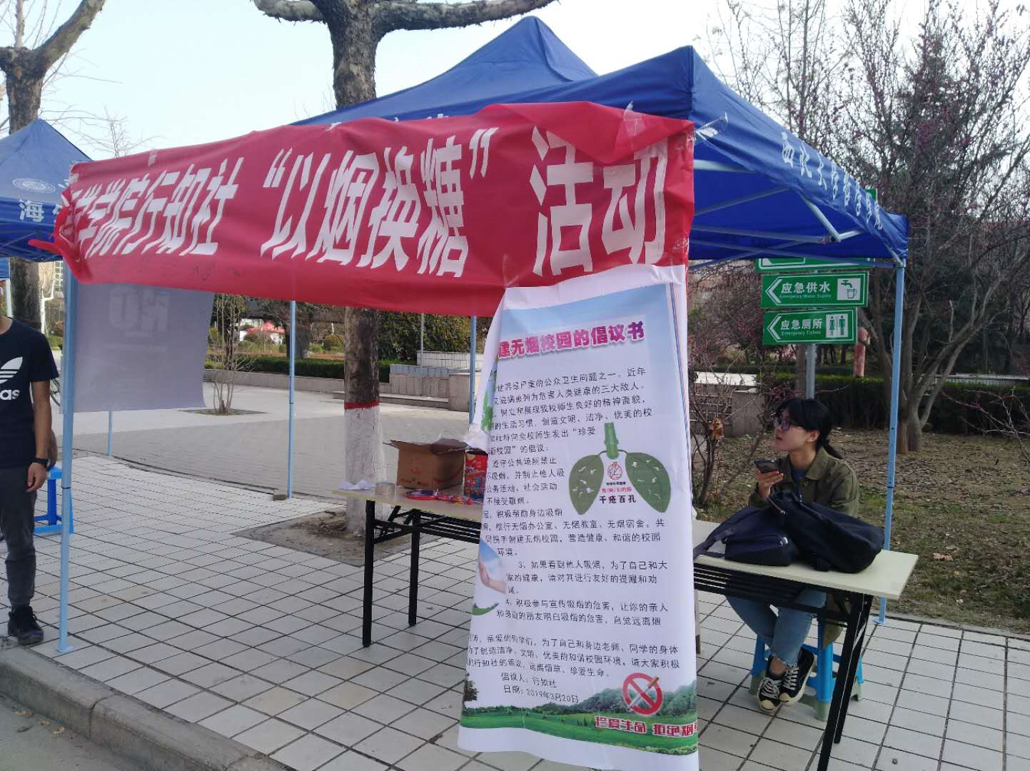 2019年3月13、14日,我院行知社在1号教学楼外举办外展,向全校师生发出《“珍爱生命、拒绝吸烟、清新校园”无烟行动倡议书》。