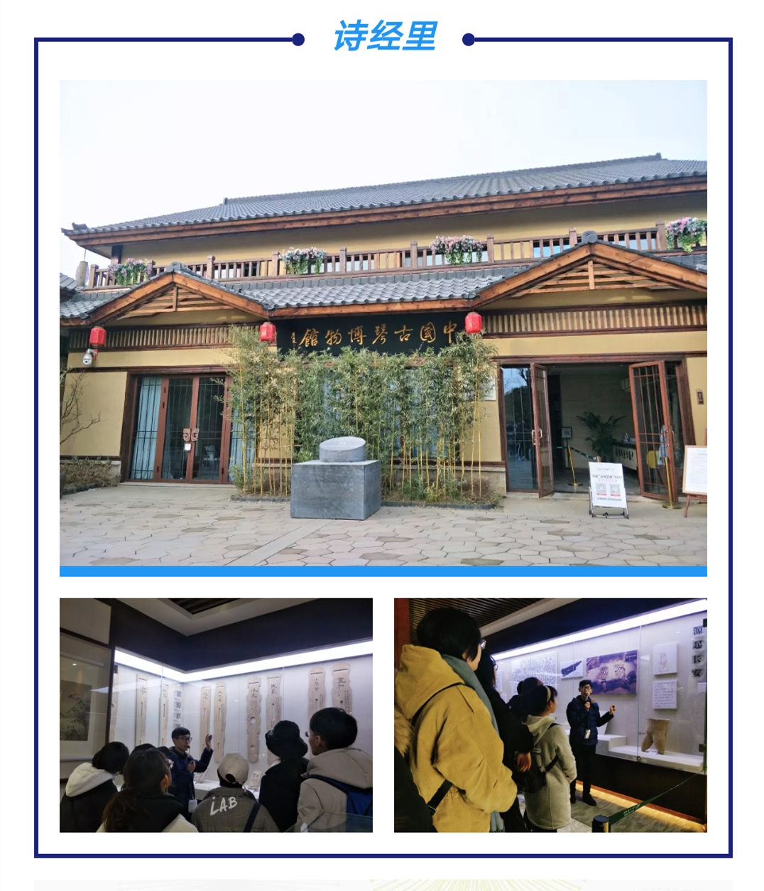 到达诗经里后,同学们首先参观了园内的古琴博物馆,在讲解员的带领下从古琴的基本形式,琴的制作工艺和琴谱三方面进一步了解中国的古琴文化。随后,同学们自由活动,亲身感受园中风光与诗经文化。诗经里推出的一系列特色主题——风雅诗颂,采薇归朴,抄诗感悟,窈窕淑女,曲水流觞。同学们也在参观过程中充分体验了到诗意匠心的生活方式。